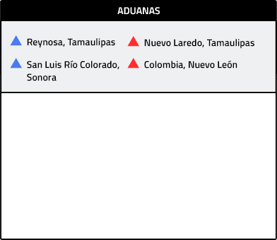 Nuestra flotilla está lista para dar servicio de transfer en las aduanas de Nuevo Laredo y Colombia además, contamos con socios comerciales en las aduanas de Reynosa y San Luis Río Colorado;